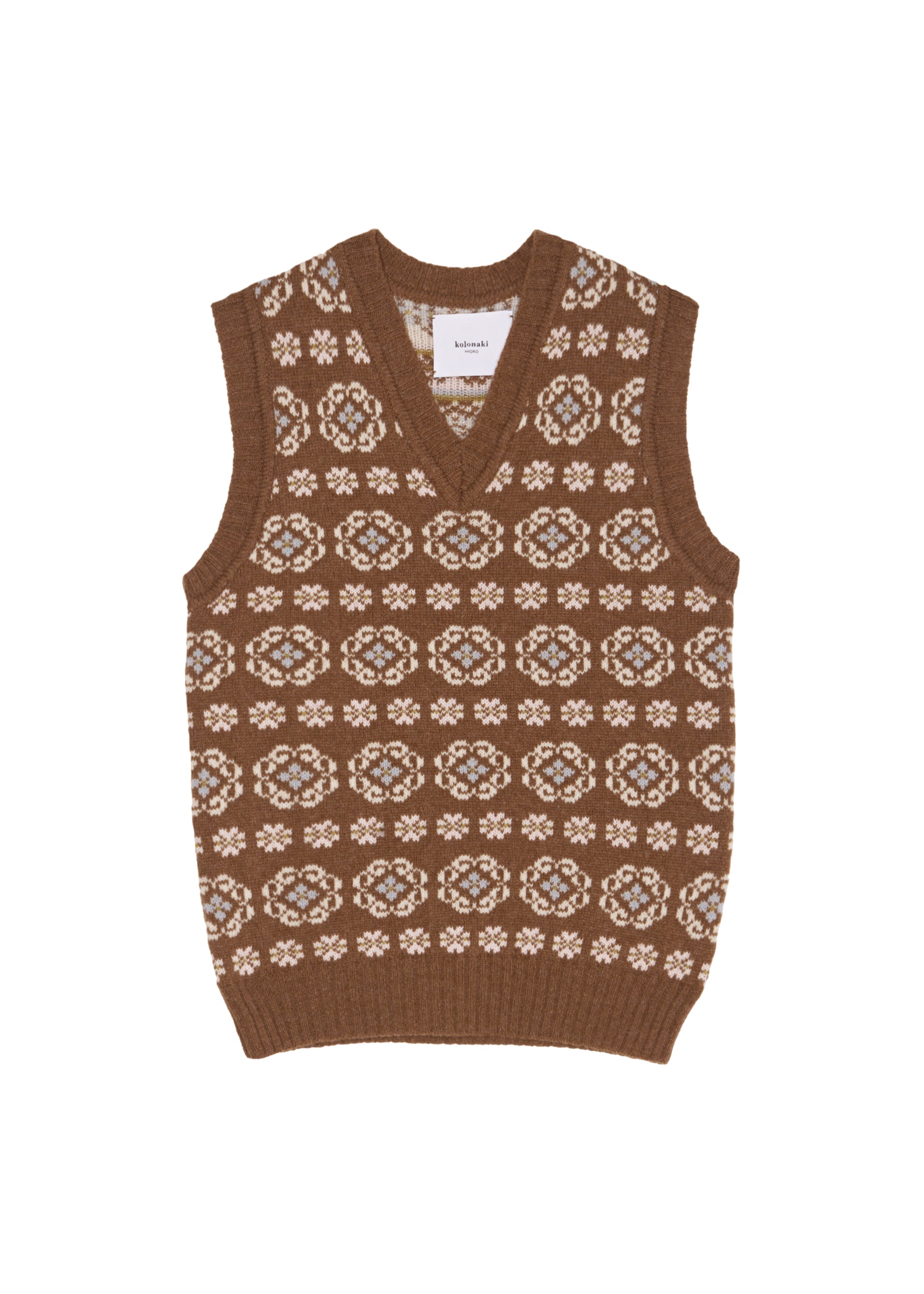 El chaleco Lucy actualiza el chaleco jacquard clásico a partir de patrones de grecas recuperados de diseños antiguos de nuestro archivo. Ajustamos escala y ritmo sobre un marrón cálido con contraste crudo para un dibujo nítido y equilibrado.